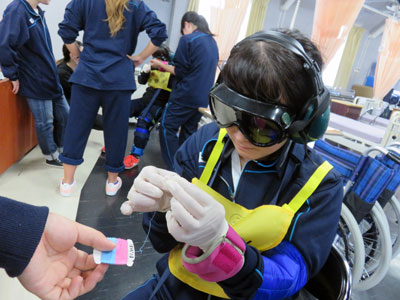 高齢者疑似体験をしている様子です。若者や健常者であれば問題なくできることが、高齢者疑似体験セットを装着するとできにくくなります。高齢者の気持ちが理解でき、高齢者への「思いやり」「気遣い」を養います。